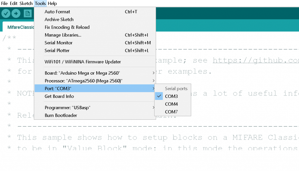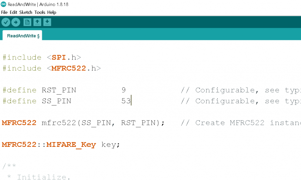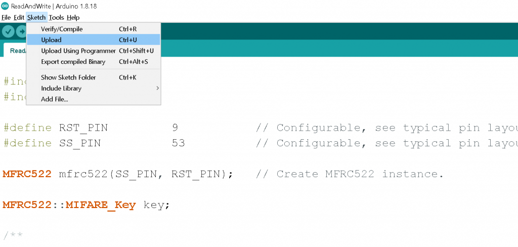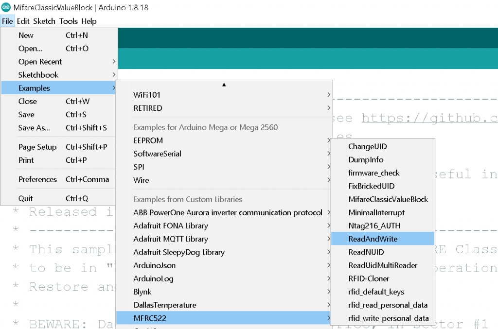 - Kemudian buka file ReadandWrite dengan pilih File – Examples – MFRC522 – ReadAndWrite