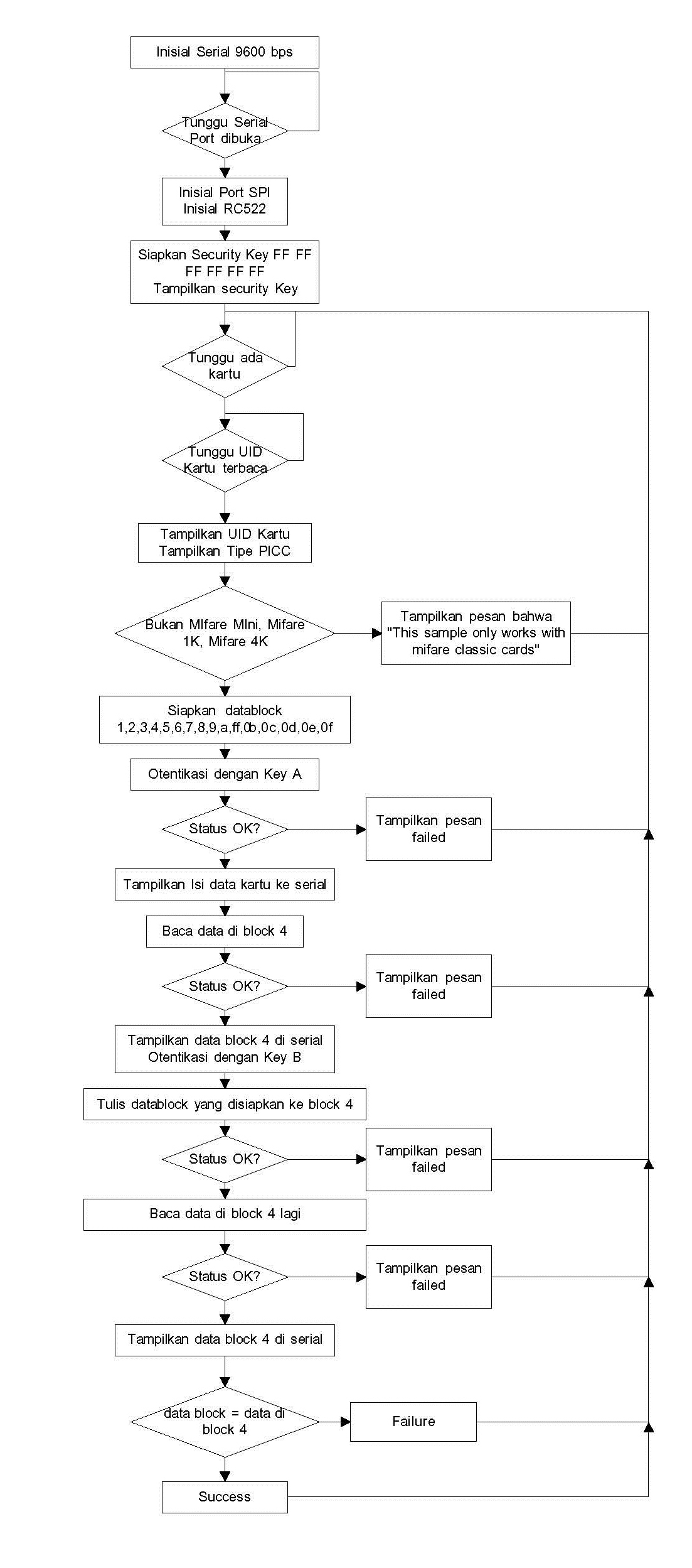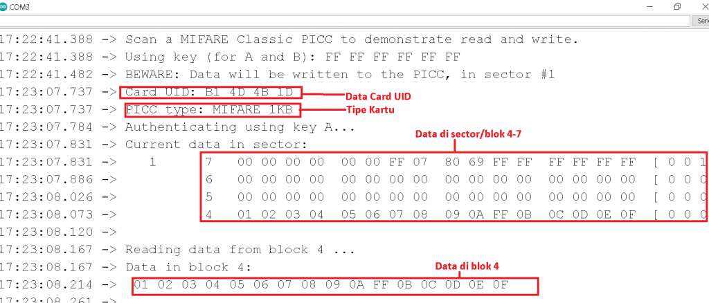 Jadi secara keseluruhan proses pada file ReadAndWrite ini adalah menampilkan Card UID dan tipenya, lalu membaca sector 4 – 7 dan menuliskan data 01, 02, 03 hingga 0xF ke sector 4 serta diakhiri dengan menampilkan hasil penulisan di sector 4. Juga total data di sector 4 hingga 7