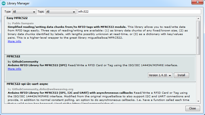 - Apabila Example MFRC522 tidak terlihat pada pilihan maka berarti Arduino IDE kita belum terinstalasi dengan library MFRC522. Pilih Manage Library dan cari MFRC522 di bagian search