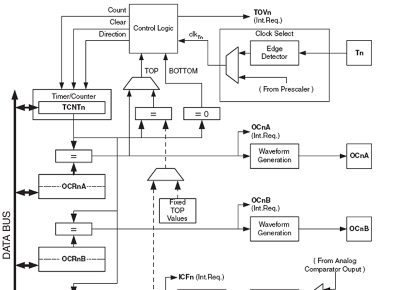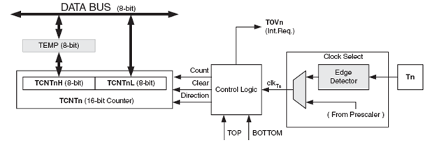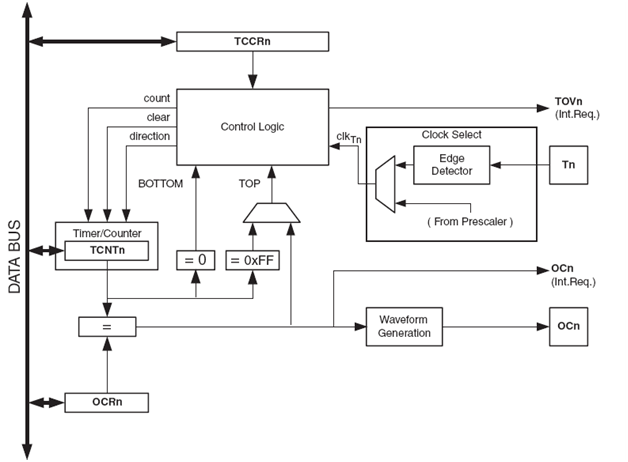 TCNT0 dan OCR0 adalah 8 bit Register di mana keduanya akan dibandingkan dan dapat digunakan oleh Waveform Generation untuk membangkitkan PWM atau berbagai frekwensi pada pin OC0. Sumber clock dari counter dapat diambil dari External (T0) atau dari internal melalui Pre Scaler, hal ini diatur oleh Clock Select bit (CS2:0) yang ada di Register TCCR0.