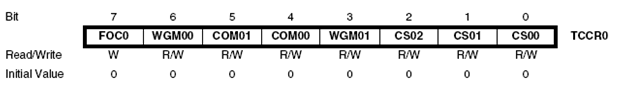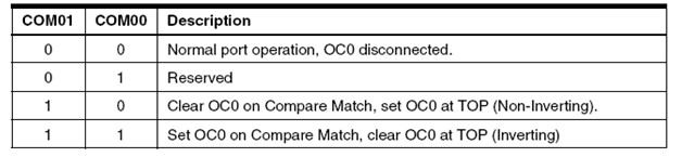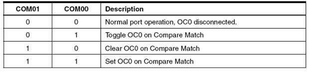 Bit ini berfungsi mengatur keluaran pada pin OC0 sesuai pada tabel-tabel berikut. Namun terlebih dahulu Data Direction pada OC0 harus diaktifkan sebagai keluaran.