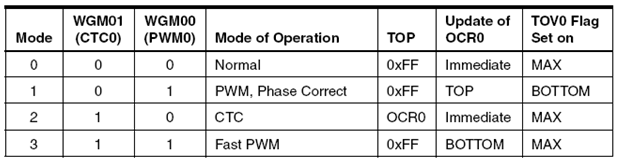 Pengaturan mode operasi timer ini dilakukan oleh bit WGM01:0 untuk waveform generation dan bit COM01:0 untuk Compare Output Mode. Berikut adalah mode-mode operasi tersebut.