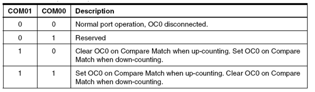 Bit Compare Output Mode (COM01:0) memiliki dua fungsi yaitu mengatur Waveform Generator untuk menentukan kondisi OC0 pada saat Compare sesuai (match) atau mengendalikan pin OC0.