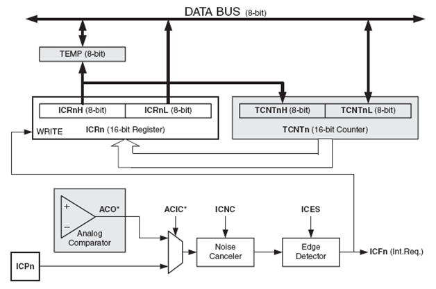 Untuk bagian Register Input Capture, register ini berfungsi sebagai penyimpan nilai counter yang dibangkitkan dengan sumber clock dari pin ICP1 atau juga dapat melalui Analog Comparator. Pin ICP1 ini juga memiliki noise canceler yang akan mereduksi noise yang diterima sehingga diperoleh perhitungan nilai counter yang akurat.