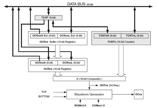 Register OCR1A dan OCR1B akan selalu dibandingkan dengan counter TCNT1 dan hasilnya akan diproses oleh Waveform Generator dan ditampilkan ke pin OC1 apabila Data Direction OC1 diset sebagai keluaran. Hasil perbandingan tersebut juga akan mempengaruhi OCF1A dan OCF1B apabila nilai TCNT1 mencapai nilai yang sama dengan OCR1A atau OCR1B