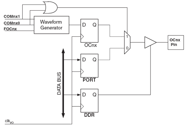 Waveform Generator akan menghasilkan output pada saat diperoleh kondisi match sesuai dengan mode yang ditentukan oleh bit WGM13:0 dan CM1x1:0.