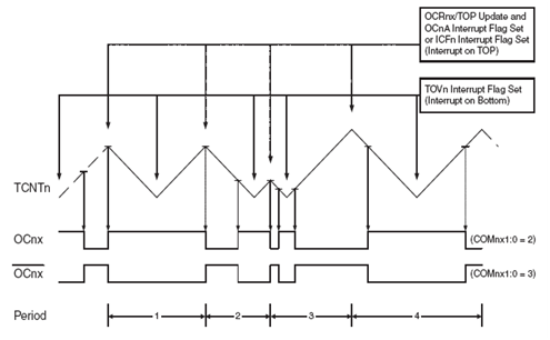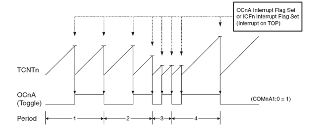 Timer Overflow Flag akan selalu set pada setiap saat counter mencapai nilai BOTTOM. Interupsi dapat dibangkitkan pada saat ini apabila bit interupsi ini diaktifkan.