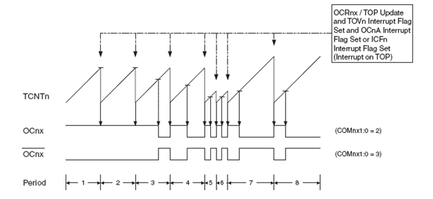 Mode ini akan menghasilkan PWM dengan frekwensi yang tinggi di mana counter akan menghitung dari nilai BOTTOM hingga TOP dan kembali lagi dari BOTTOBOTTOM. Timing Diagram pada mode ini tampak pada gambar di bawah ini.