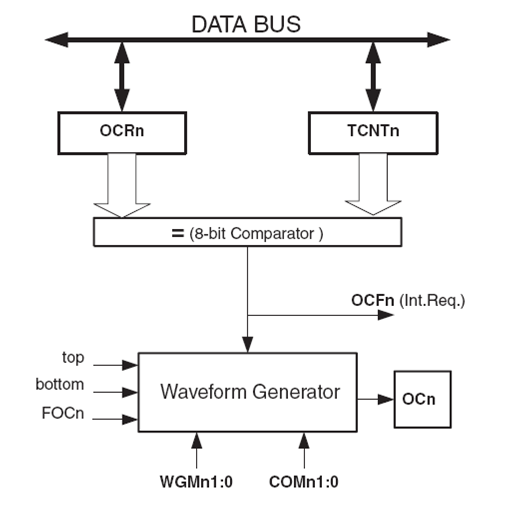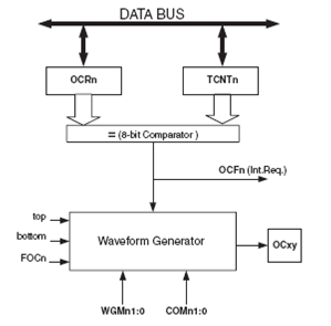 Register OCR2 yang bersifat double buffer akan membandingkan nilainya dengan TCNT2 dan hasilnya akan digunakan oleh Waveform generator untuk membangkitkan sinyal PWM atau frekwensi yang bervariasi pada pin OC2. Pada saat diperoleh kondisi match maka OCF2 akan set dan interupsi akan terjadi apabila Output Compare Match Interrupt aktif.