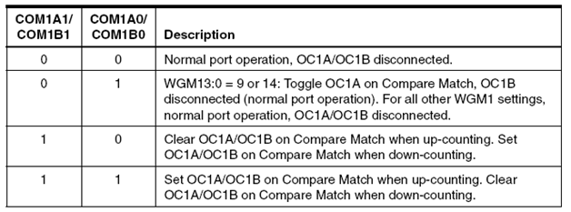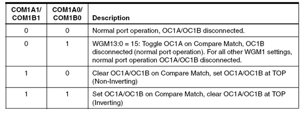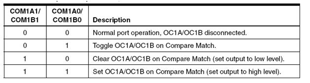 Bit Compare Output Mode (COM11:0) memiliki dua fungsi yaitu mengatur Waveform Generator untuk menentukan kondisi OC1 pada saat Compare sesuai (match) atau mengendalikan pin OC1.