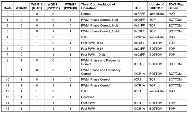 Pengaturan mode operasi timer ini dilakukan oleh bit WGM13:0 untuk waveform generation dan bit COM1x1:0 untuk Compare Output Mode. Berikut adalah mode-mode operasi tersebut.
