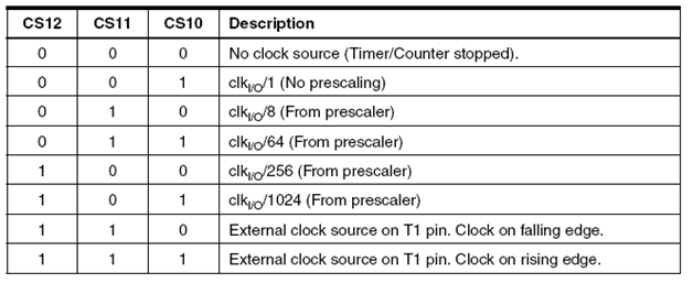 Timer/Counter dapat memperoleh clock dari external ataupun internal dan hal ini diatur oleh bit CS12:0 yang terletak pada Register TCCR1B.