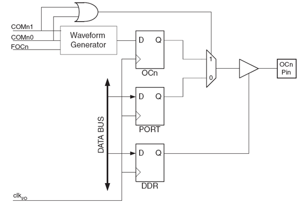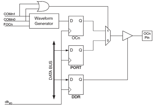 Namun pin OC1 masih tergantung oleh DDR pada port tersebut. DDR_OC1 terlebih dahulu harus diset sebagai output agar nilai OC1 dapat tampil di kaki OC1.