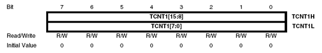 Register TCNT1 yang menyimpan nilai counter adalah merupakan register 16 bit sehingga untuk mengaksesnya diperlukan perlakuan khusus yaitu dengan menuliskan high byte terlebih dahulu ke TCNT1H agar disimpan di TEMP dan selanjutnya low byte ke TCNT1L dan selanjutnya keduanya diteruskan ke TCNT1.