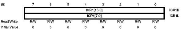 Proses pembacaan ICR1 dilakukan dengan membaca low byte pada ICR1L terlebih dahulu dan dilanjutkan dengan high byte pada ICR1H.