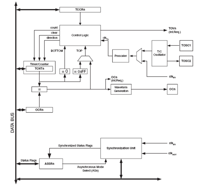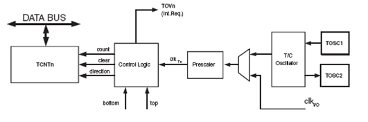 Timer dan counter dapat memperoleh clock secara internal melalui prescaler atau secara asinkron melalui kaki TOSC ½. Mode Asinkron ini diatur oleh Register ASSR.