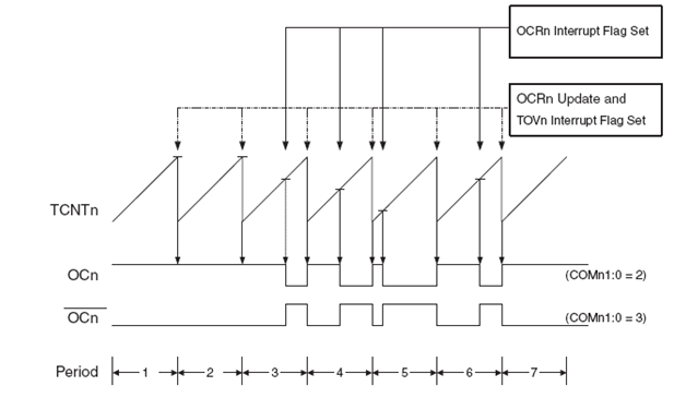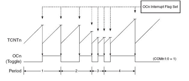 Timer Overflow Flag akan selalu aktif saat counter mencapai nilai maksimal. Interupsi juga akan terjadi pada kondisi ini apabila bit pengatur interupsinya diaktifkan. Pada mode non inverting OC1x akan set apabila TCNT1x dan OCR1x memperoleh nilai yang sama dan set saat mencapai nilai BOTTOM, namun pada mode Inverting OC1x akan clear apabila TCNT1x dan OCR1x memperoleh nilai yang sama dan clear apabila mencapai nilai BOTTOM. Agar signal tersebut muncul pada kaki OC0, terlebih dahulu Data Direction dari OC0 harus diset satu yang berfungsi sebagai keluaran.