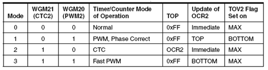 Pengaturan mode operasi timer ini dilakukan oleh bit WGM21:0 untuk waveform generation dan bit COM21:0 untuk Compare Output Mode. Berikut adalah mode-mode operasi tersebut.