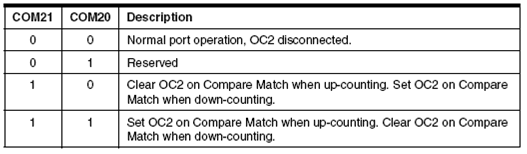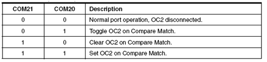 Bit Compare Output Mode (COM21:0) memiliki dua fungsi yaitu mengatur Waveform Generator untuk menentukan kondisi OC2 pada saat Compare sesuai (match) atau mengendalikan pin OC2.