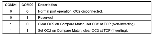 Bit ini berfungsi mengatur keluaran pada pin OC2 sesuai pada tabel-tabel berikut. Namun terlebih dahulu Data Direction pada OC2 harus diaktifkan sebagai keluaran.