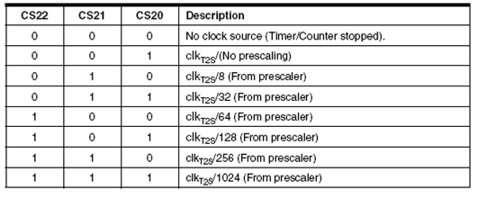 Untuk memilih sumber clock dari counter ini dapat dilakukan dengan mengatur bit CS22:0 (Clock Select Bit). Proses perhitungan counter diatur oleh bit WGM20 dan WGM21 yang terletak pada TCCR2 yang menentukan bagaimana gelombang yang akan dibangkitkan pada kaki OC2.