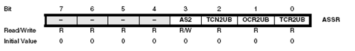Saat AS2 = 0 maka timer / counter akan mendapat clock dari internal namun apabila AS2=1 maka timer/counter akan mendapat clock dari external melalui pin TOSC1. Pada saat perubahan nilai pada AS2 maka TCNT2, OCR2 dan TCCR2 mungkin juga akan berubah.