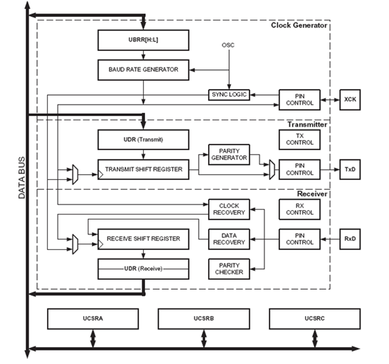 – Clock Generator yang terdiri dari synchronization logic, baud rate generator dan XCK pin (untuk mode synchronous)