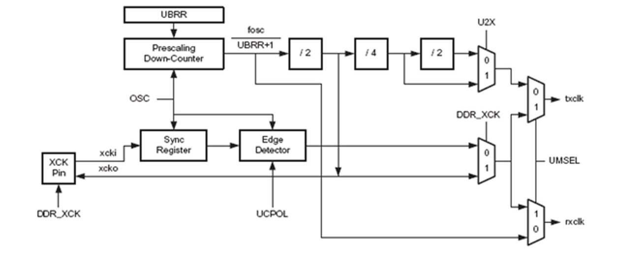 Tampak pada gambar di atas bahwa baud rate dari internal clock diatur oleh Pre Scaler yang diberi nilai dari register UBRR dan untuk external clock diatur melalui XCK pin yang disinkronkan dengan osilator dan dikondisikan oleh Edge Detector.