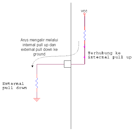 Aliran arus saat internal pull up aktif dan external pull down terpasang