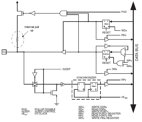 Dari gambar 1.4 terlihat bahwa internal pull up diatur oleh kondisi bit PUD, DDRxn dan Portxn. Apabila PUD berlogika 0 , DDRxn berlogika 0 (sebagai masukan) dan Portxn berlogika 1 maka internal pull up akan aktif.