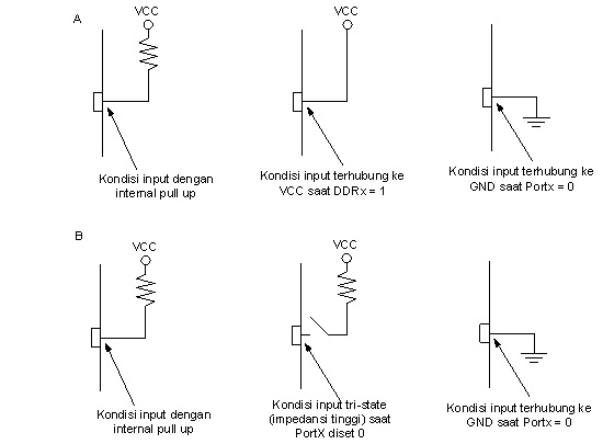 Masing-masing port memiliki internal pull up yang dapat diatur berdasarkan kondisi logika pada bit PUD (Pull up disable) yang ada di register MCUCR. Apabila bit ini berlogika 1 maka dinyatakan bahwa internal pull up disable atau tidak aktif sedangkan bila bit ini berlogika 0 maka dinyatakan bahwa internal pull up aktif.
