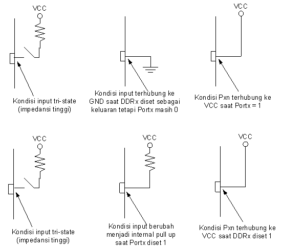 – Atau bila diletakkan dengan mengubah Portxn menjadi logika 1 maka Pxn akan berada pada kondisi internal pull up terlebih dahulu sebelum DDRxn diatur menjadi keluaran (logika 1), kecuali bila PUD bit diatur pada kondisi logika 0.