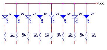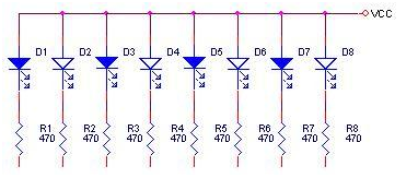 8 bit LED Logic Tester mempunyai common yang terhubung ke anoda (VCC) dan input yang terhubung ke katoda LED melalui resistor, oleh karena itu logic 0 (tegangan 0 volt) akan diwakili dengan nyala LED dan logic 1 (tegangan 5 volt) akan diwakili dengan LED yang padam