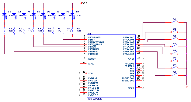 Masing-masing port dari ATMega8535 dilengkapi dengan dua buah dioda yang terhubung antara kaki port dengan ground dan kaki port dengan VCC untuk memproteksi port tersebut dari tegangan berlebih yang biasa ditimbulkan oleh noise ataupun elektro statis. Masing-masing port ini juga mempunyai arus yang mampu mengaktifkan LED secara langsung.