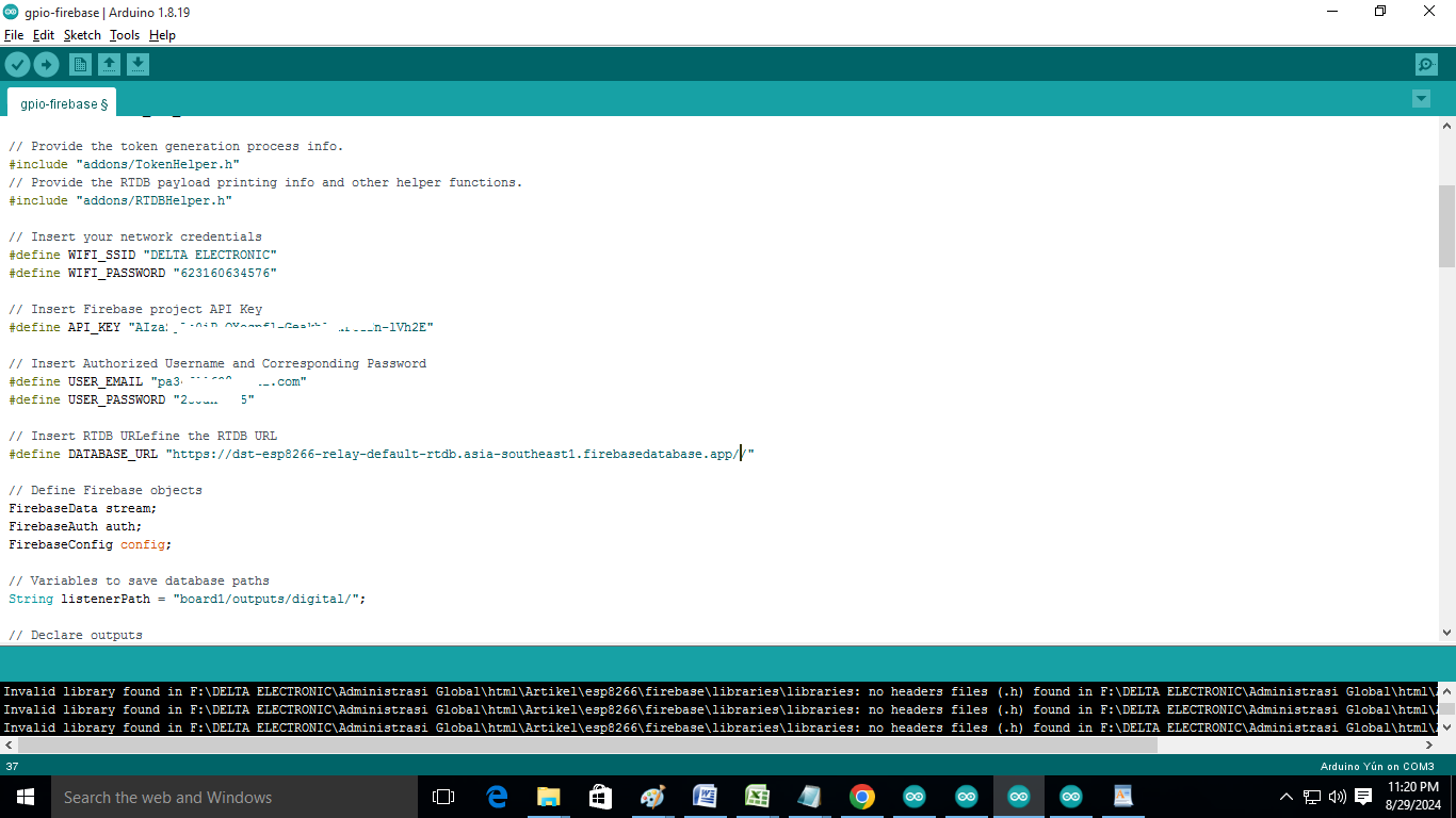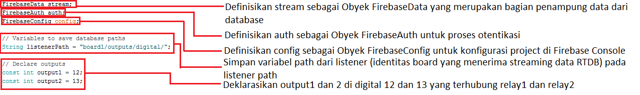 - Includekan library-library yang digunakan dan juga parameter-parameter yang dibutuhkan agar DST-ESP8266 terhubung dengan Project anda yang ada di Firebase