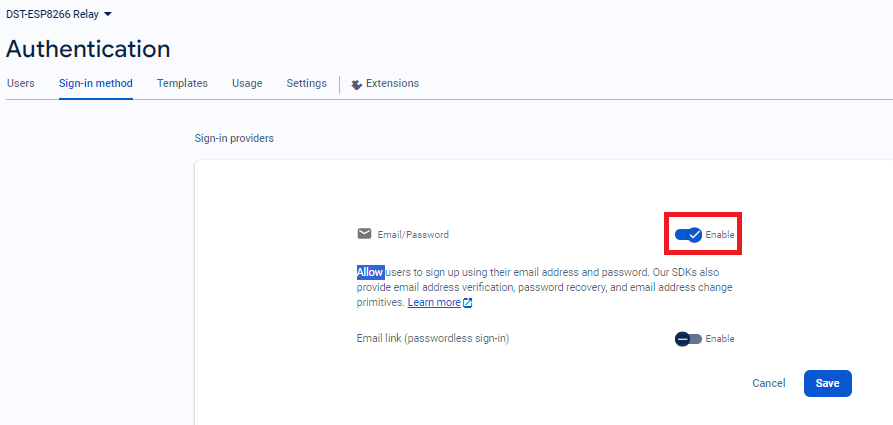 - Aktifkan otentikasi dengan klik enable dan non aktifkan email link (passwordless sign-in) dengan klik disable kemudian klik save