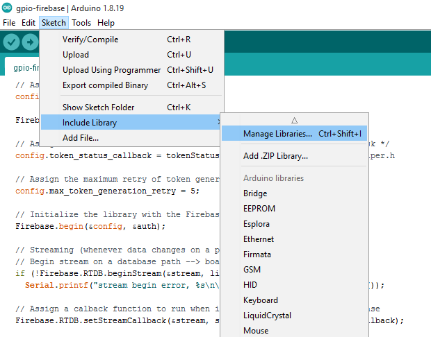 - Masuk ke Sketch -> Include Library -> Library Manager dan ketik Firebase ESP Client di kolom pencarian