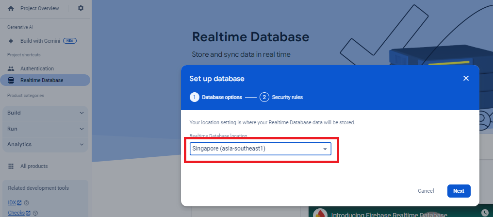 - Pada bilah samping kiri klik build lalu Realtime Database dan kemudian klik Create Database
