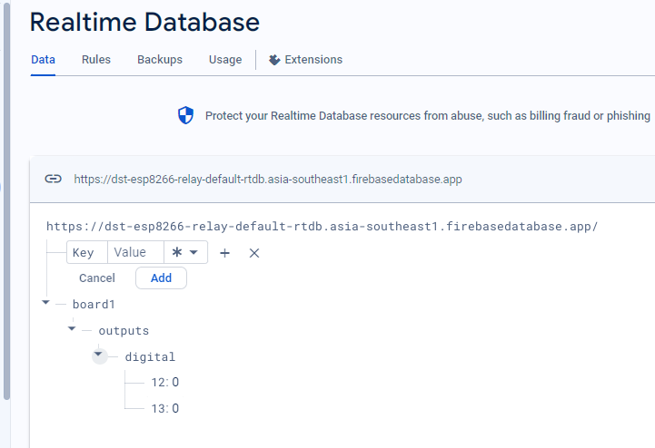 Pada database di atas mempresentasikan board 1 dalam hal ini DST-ESP8266 memiliki output digital sebanyak 2 dan didefinisikan di digital 12 dan digital 13 dengan nilai awal 0 atau logika LOW. Karena Relay pada DST-ESP8266 active LOW maka pada kondisi awal kedua relay akan ON