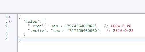 - Setup Database Security Rules, selanjutnya kita perlu membuat rule yang dibutuhkan untuk mengakses database ini. Hal ini dapat dilakukan dengan klik di Realtime Database, pilih tab Rules pada bagian atas lalu Edit Rules dan akan tampil rule seperti ini