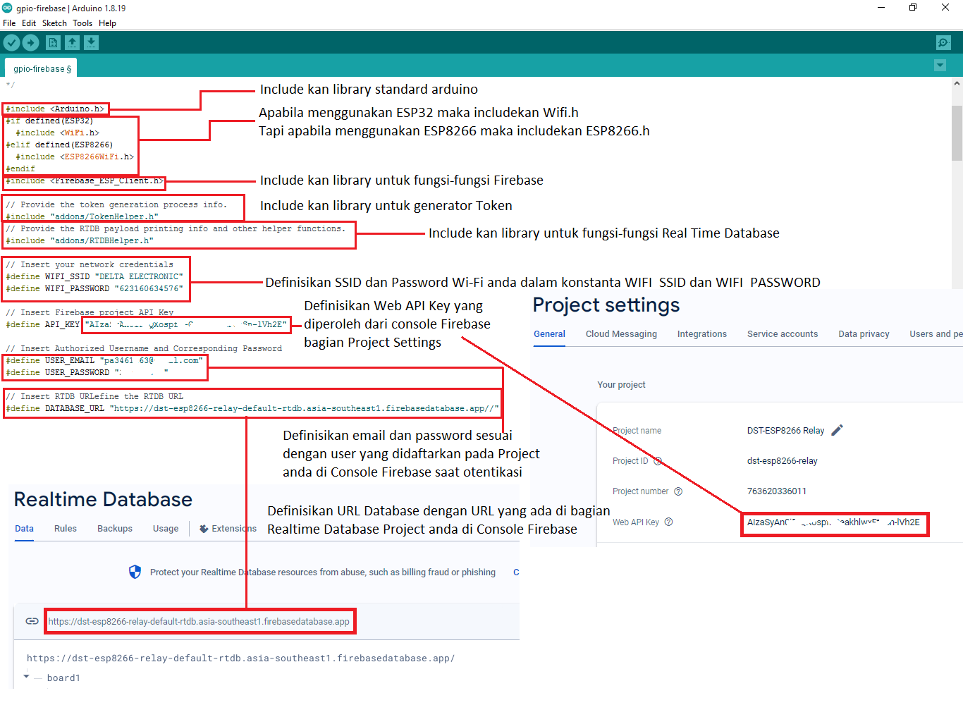 Screen Shot Arduino IDE + screen shot2 Project di Console Firebase