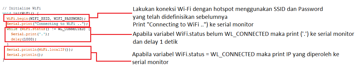 - Pada bagian function InitWiFi berikut proses yang dilakukan dalam function ini