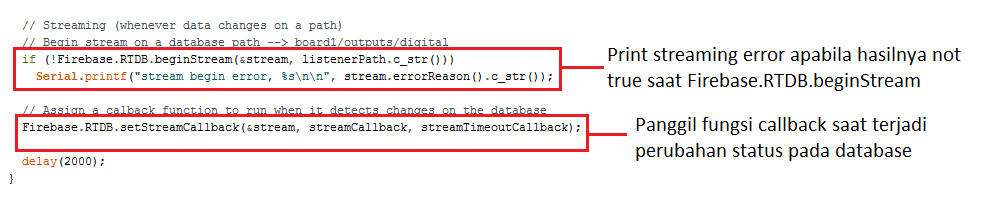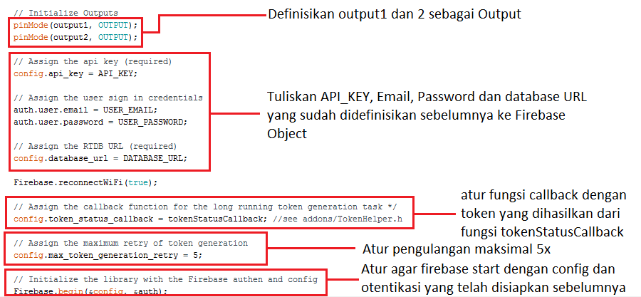 - Pada bagian loop hanya ada fungsi refreshToken yang dipanggil saat time out yang fungsinya untuk mereload kondisi GPIO sesuai dengan data yang ada di RTDB setelah beberapa saat untuk sinkronisasi.