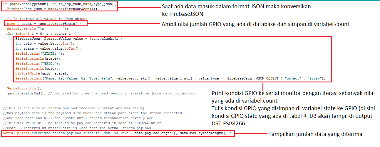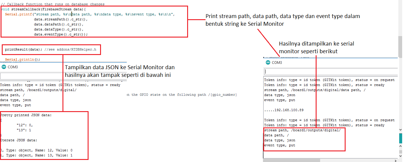 - Sekarang kita coba lihat lebih detail pada bagian fungsi streamCallback dan bagaimana proses yang terjadi di dalamnya. Pada saat fungsi streamCallback dipanggil maka obyek data dengan tipe FirebaseStream diinputkan pada saat fungsi ini dipanggil. Dari obyek ini maka akan kita peroleh Stream path, data path, data type dan event type.