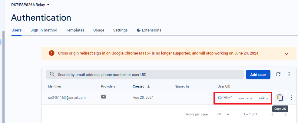 - Untuk mendapatkan UID bisa dilihat dengan klik Authentication di bilah samping kiri lalu lihat di bagian yang ada kotak merah di bawah ini dan klik copy